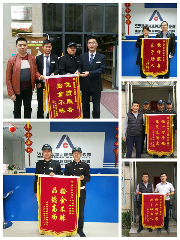 金秋十月,在這象征收獲的季節(jié),建業(yè)物業(yè)全體員工如家人一般貼心守候在業(yè)主的身旁,帶來了許多溫暖和感動(dòng)。十月,我們收到拾金不昧、技術(shù)高超、服務(wù)熱情、助人為樂等好人好事共32件,其中錦旗有11面,感謝信有10封,致電感謝有11例。