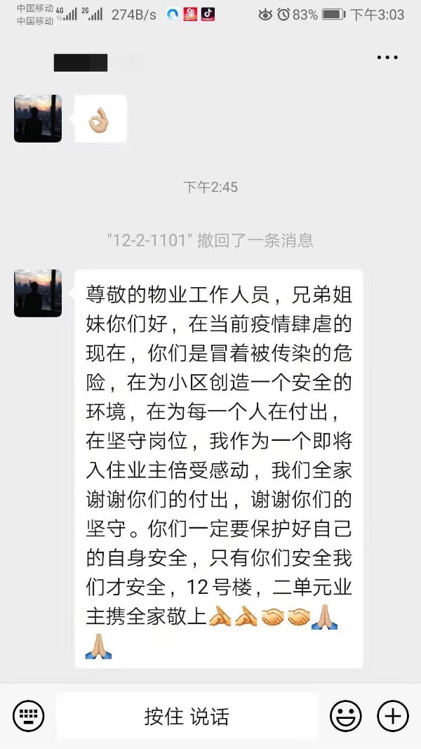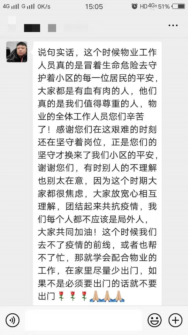 一位建業(yè)業(yè)主,同時也是集團(tuán)高層領(lǐng)導(dǎo),當(dāng)她看到奮戰(zhàn)在一線、可敬又可愛的建業(yè)物業(yè)人,每天每一時刻用血肉之軀,筑起業(yè)主安全的長城時,特別感動、特別感謝,多次流下眼淚,特發(fā)來2萬元紅包給一線的物業(yè)員工,助力物業(yè)防疫工作的進(jìn)行!