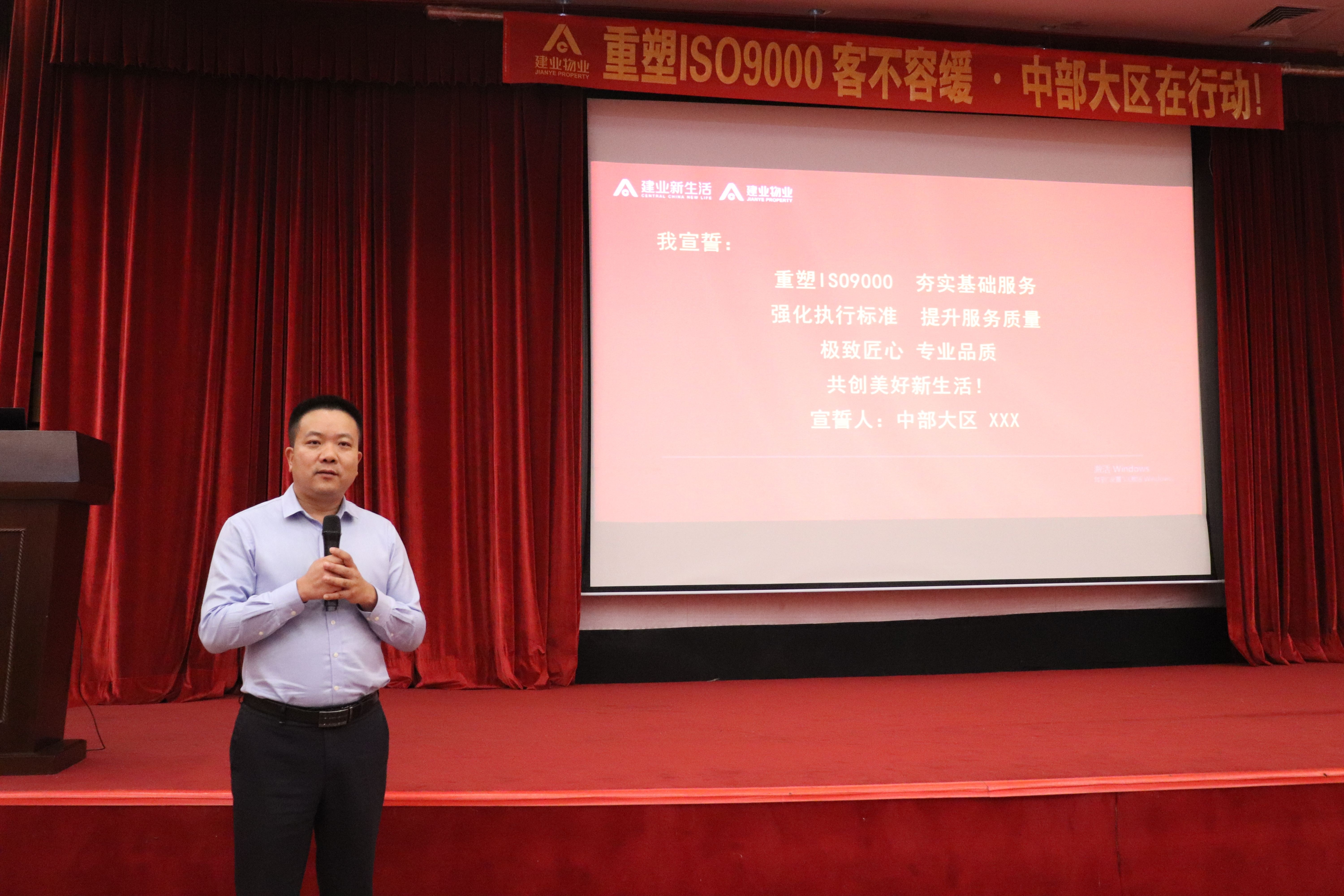 為進(jìn)一步規(guī)范員工作業(yè)標(biāo)準(zhǔn),強(qiáng)化ISO9000的執(zhí)行和落地,提升員工專業(yè)技能,夯實(shí)物業(yè)基礎(chǔ)服務(wù)。9月24日,建業(yè)物業(yè)“重塑ISO9000 客不容緩”啟動(dòng)大會(huì)在鄭州建業(yè)城市花園多功能報(bào)告廳成功召開。建業(yè)物業(yè)總經(jīng)理張禮輝、總公司各職能部門經(jīng)理級(jí)以上人員、中部大區(qū)主管級(jí)以上人員出席本次會(huì)議。