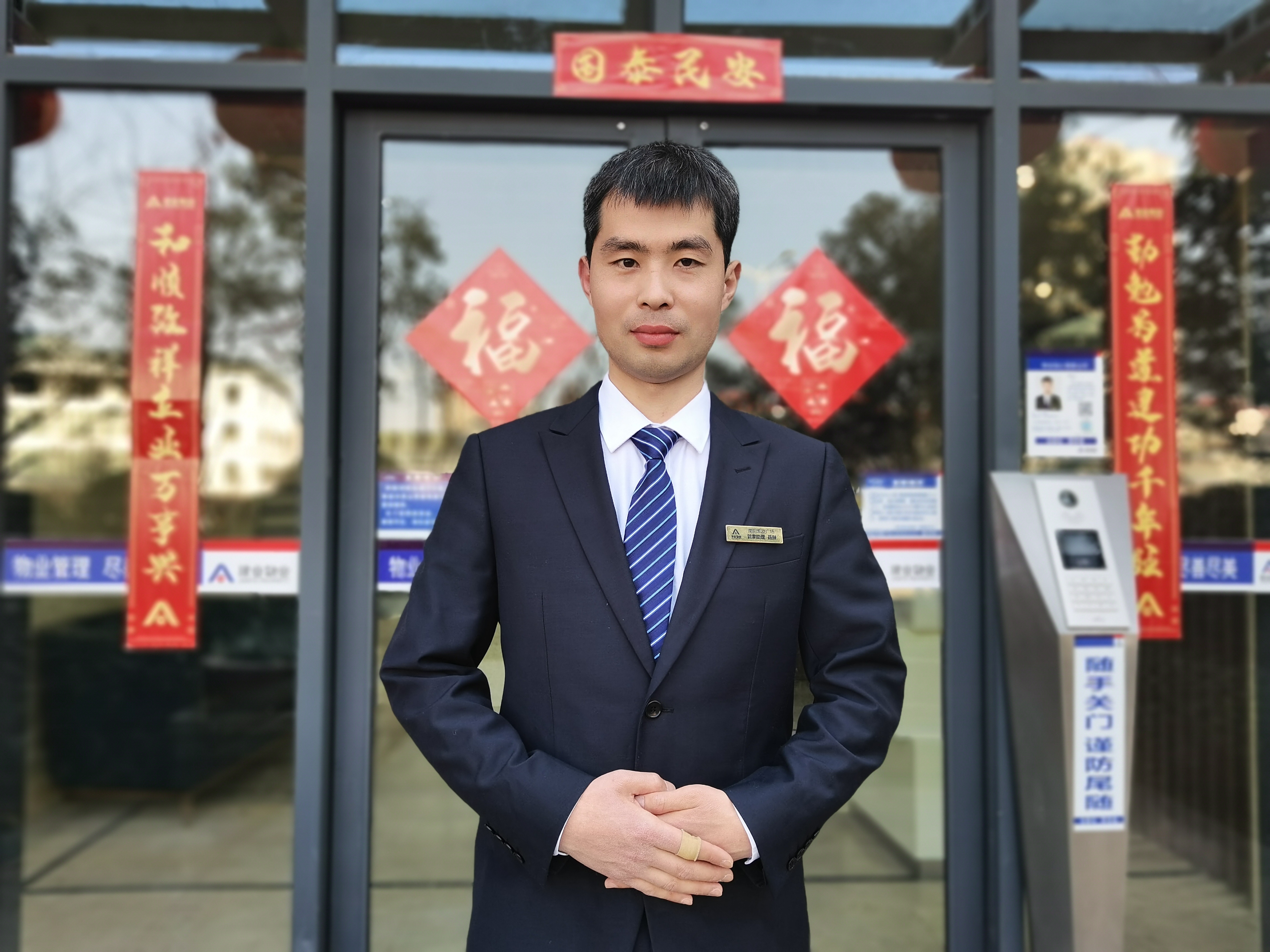 春節(jié)期間的吳師傅,是一塊“全能磚”。只要園區(qū)需要,他就可以是維修、保潔、禮兵、甚至為了協(xié)助小區(qū)幸福時光里活動的開展,扮起了“財神”。無論何種身份,他始終在守護(hù)業(yè)主的幸福年。