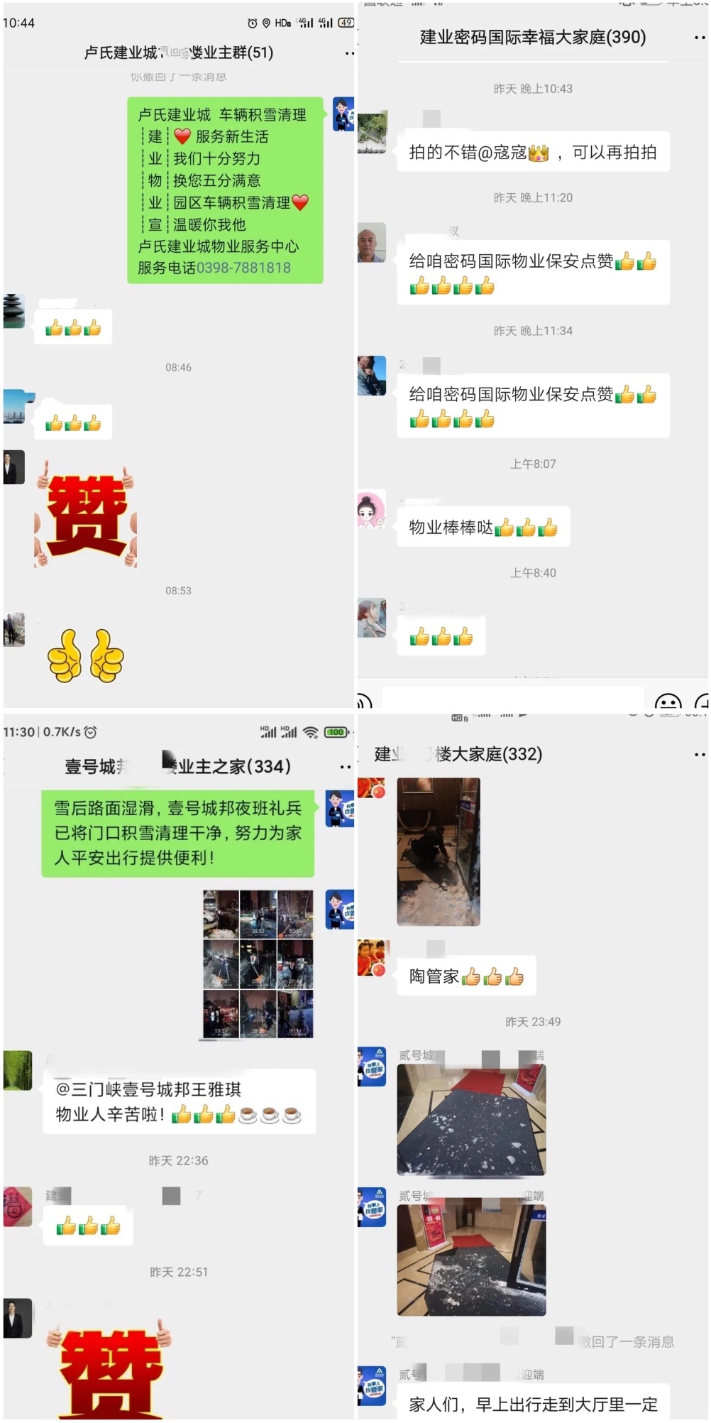 經(jīng)過連夜奮戰(zhàn),建業(yè)物業(yè)各個小區(qū)已開辟出臨時通道。天亮?xí)r分,建業(yè)物業(yè)的工作人員全員行動,將園區(qū)大小道路全部清掃干凈,確保道路通暢。在這場大雪中,建業(yè)物業(yè)用實力詮釋物業(yè)服務(wù)的專業(yè)與暖心,業(yè)主紛紛在微信群、朋友圈為建業(yè)物業(yè)點贊。