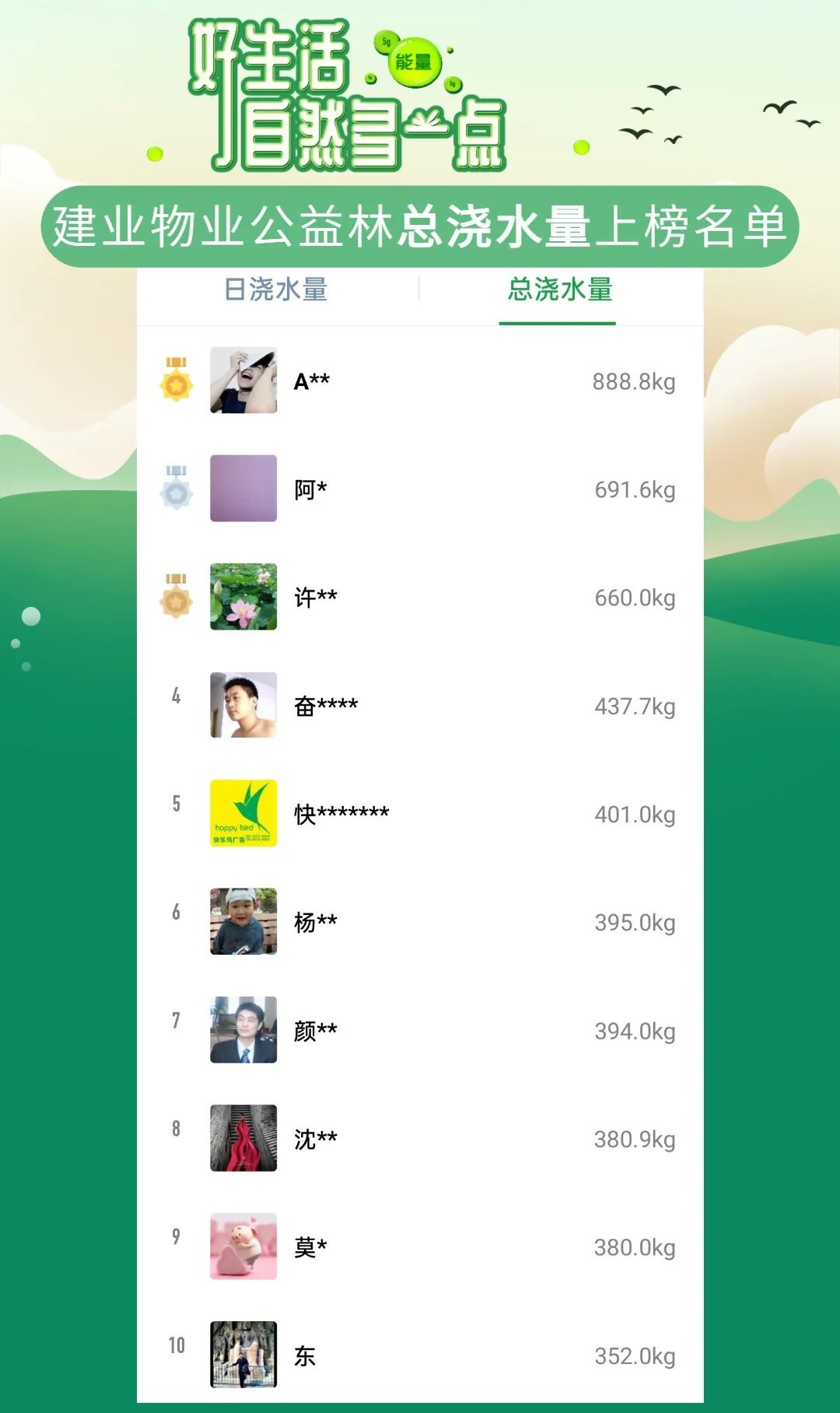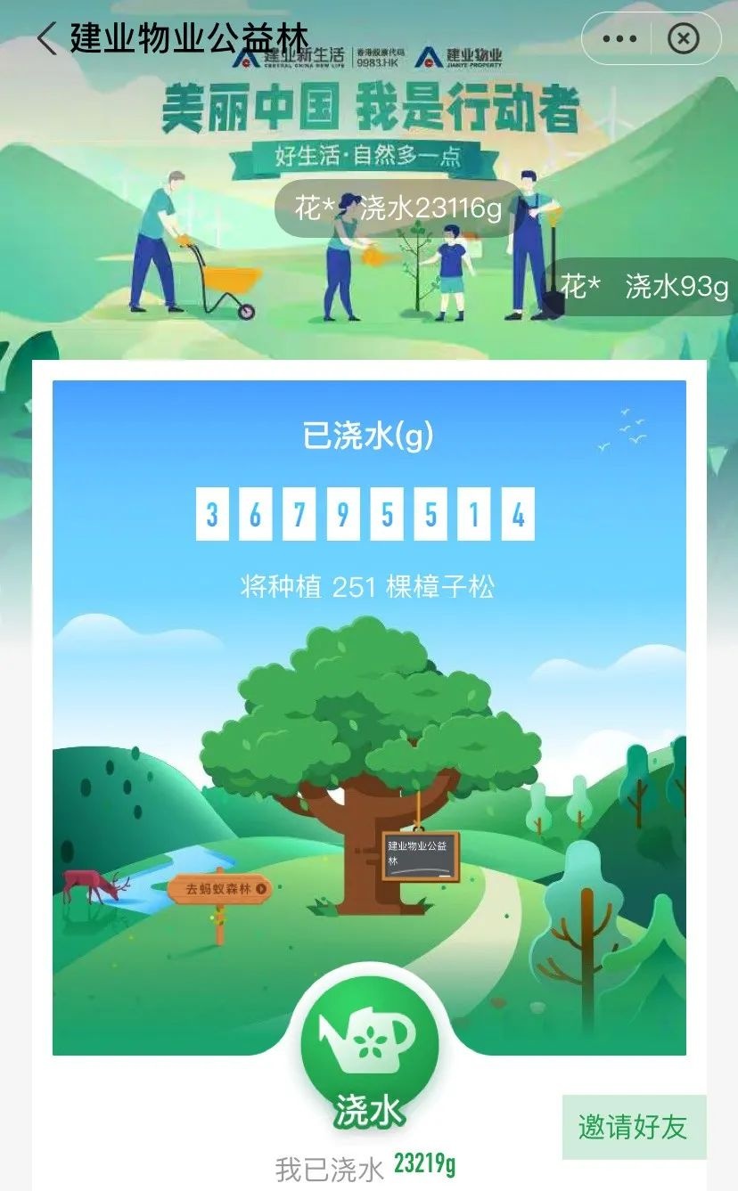 這個(gè)春天,建業(yè)物業(yè)傾力打造“好生活·自然多一點(diǎn)”主題活動(dòng)月,和業(yè)主一同加入環(huán)保、低碳的新生活方式行列,為守護(hù)自然的美好一起努力。截至3月13日,支付寶【螞蟻森林】建業(yè)物業(yè)公益林低碳打榜賽活動(dòng)圓滿舉行。新奇的玩法及裂變傳播,吸引大量業(yè)主參與,活動(dòng)期間,日均澆水量成績(jī)均能保持在螞蟻森林公益林日榜首頁(yè),總澆水量突破36.7噸,可在邊遠(yuǎn)荒漠地帶種植樟子松251棵。