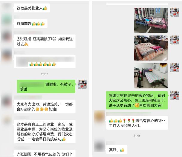 在一次日常溝通中,一名業(yè)主發(fā)現(xiàn)物業(yè)人連打地鋪的被子都少得可憐,便在業(yè)主群里號(hào)召大家支援物業(yè)。頓時(shí),業(yè)主群里沸騰起來:“我家車庫(kù)里有折疊床,拿走用吧!”“我這兒有個(gè)大床墊,被子、枕頭都是干凈的!” “還需要被子嗎?有需要我過去?!薄按蠹矣辛Τ隽?,共度難關(guān),一切都會(huì)好起來的!”“這才是真真正正的建業(yè)一家親,為堅(jiān)守崗位的物業(yè)及所有的熱心好鄰居點(diǎn)贊!”……一句句溫暖的話語,讓物業(yè)人內(nèi)心涌動(dòng)著一股股暖流。