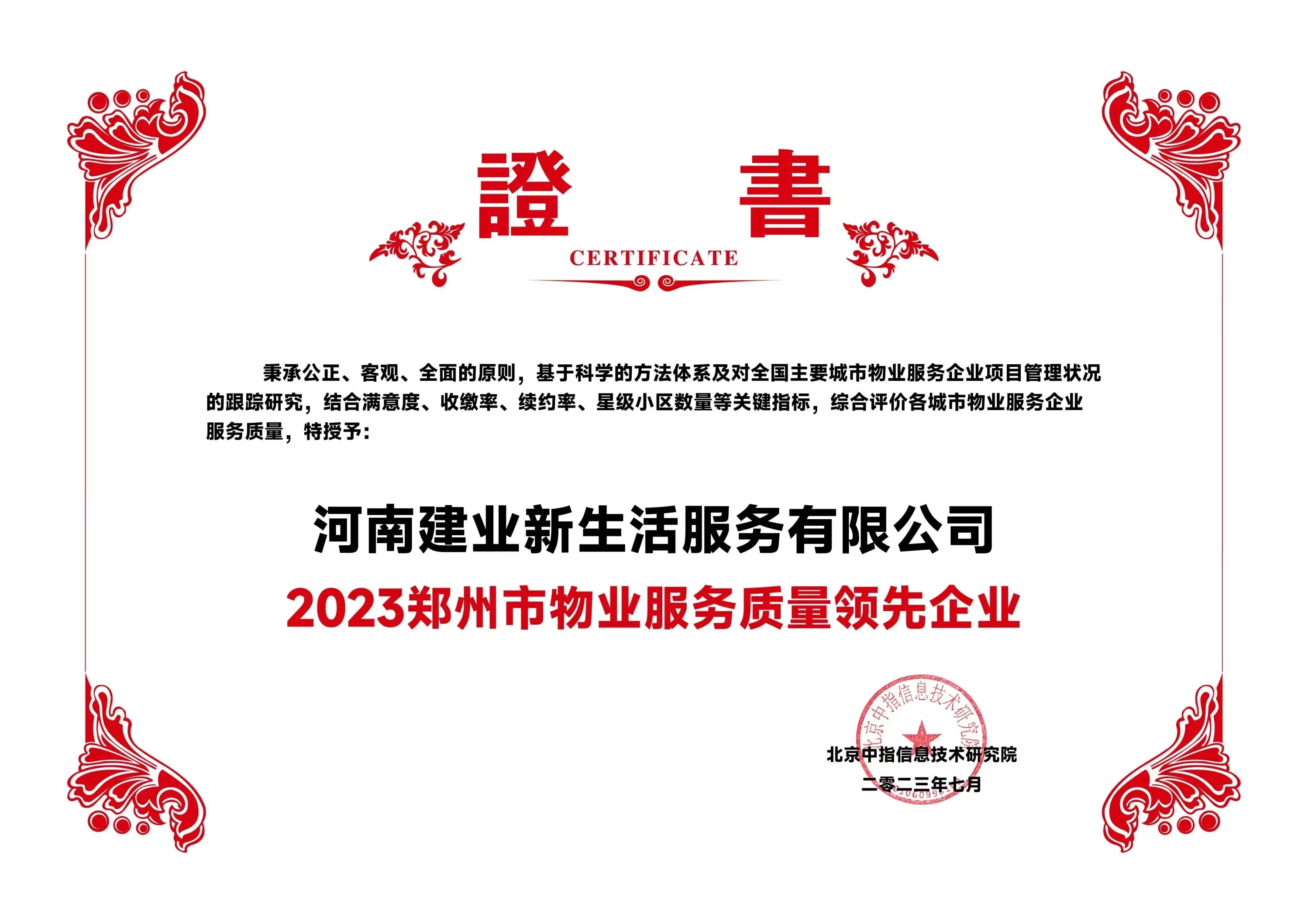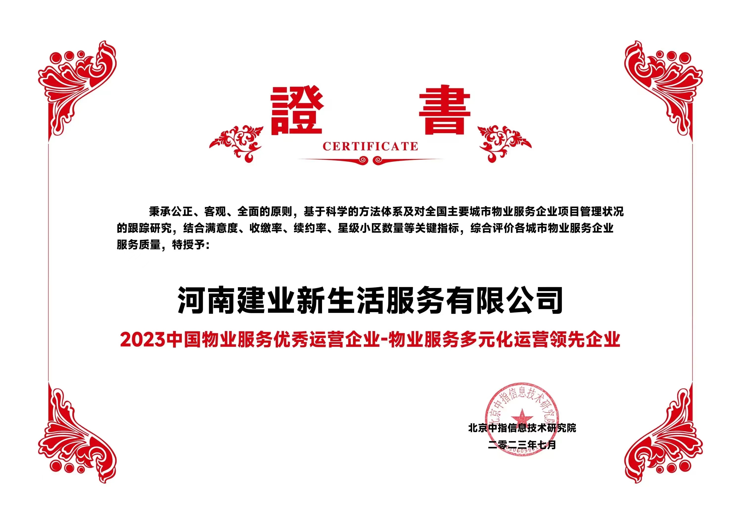 一直以來,建業(yè)新生活堅持客戶至上的原則,不斷提升服務(wù)質(zhì)量,持續(xù)滿足客戶多樣化的生活需求,公司多元化的物業(yè)服務(wù)運營模式及出色業(yè)績在業(yè)界贏得廣泛贊譽。此次獲獎不僅代表了專業(yè)領(lǐng)域?qū)τ诮I(yè)新生活持續(xù)穩(wěn)定發(fā)展的肯定,也是對其運營實力和服務(wù)質(zhì)量的高度認可。